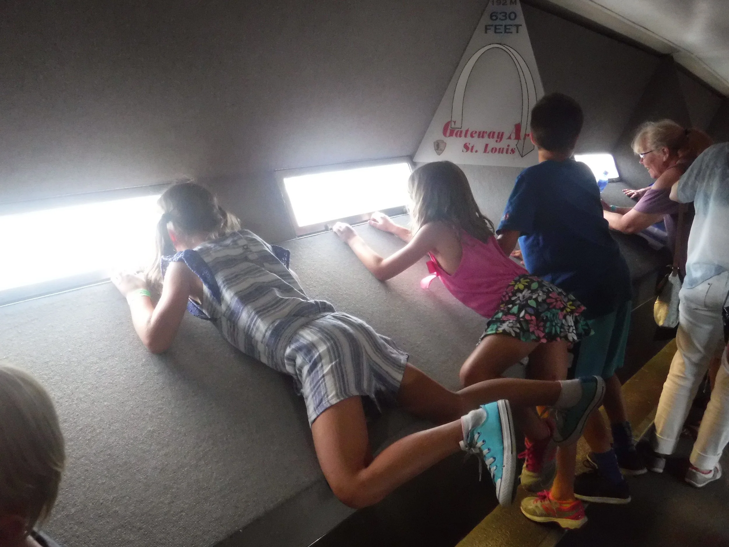 The kids peering over St. Louis from the observatory of the St. Louis Arch.